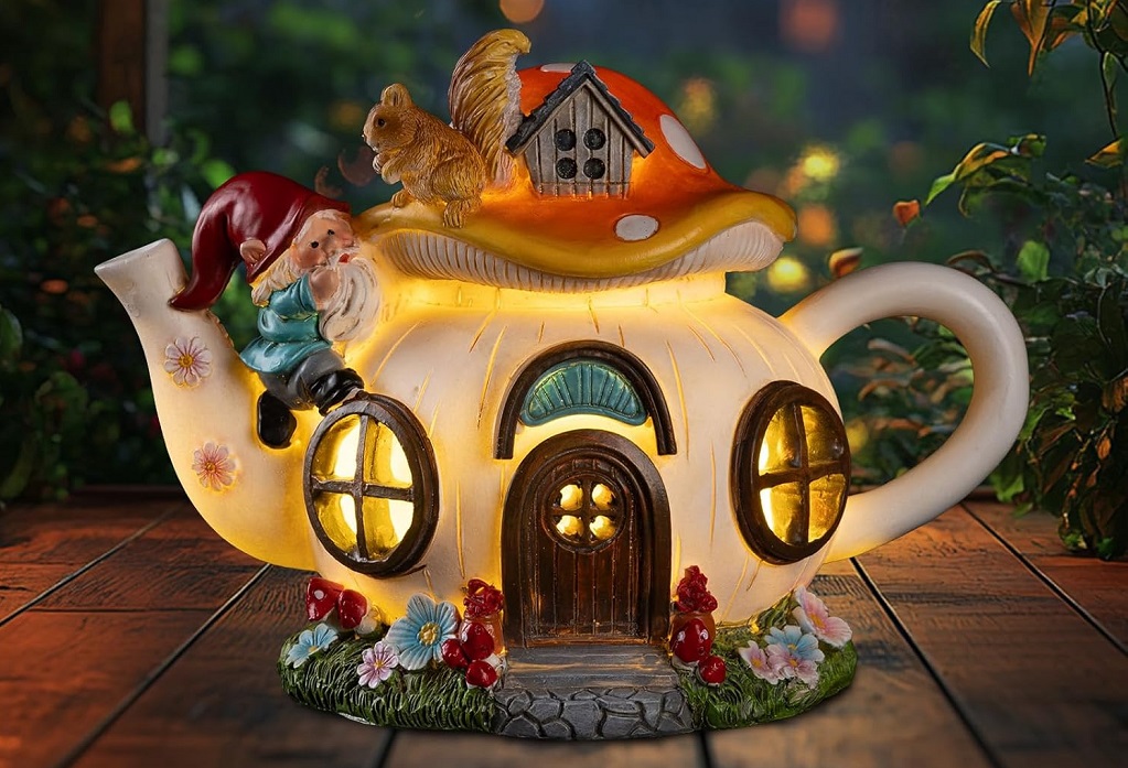 The Solar Powered Fairy House will add some magic to your garden day and night. This solar-powered house combines a whimsical mushroom house design with a charming garden gnome and a playful squirrel, creating a magical atmosphere in your garden or outdoor space. The detail on each piece is very charming.